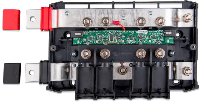 A modular DC busbar with spaces for four DC fuses. It monitors the status of each fuse and displays its condition with an LED on the front. The Lynx Distributor is part of the modular Lynx distribution system, available as M8 and M10 models.