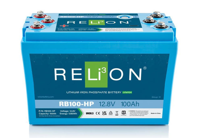RELiON's RB100-HP is a Group 31 12V, 100Ah deep-cycle lithium-ion battery built for starting and cycling.