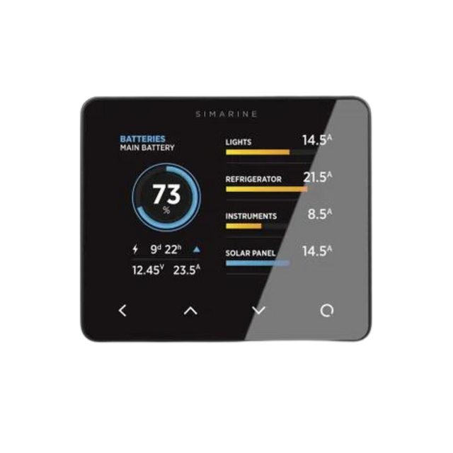 SIMARINE's advanced battery monitor for most demanding users. For up to 6 battery banks, 6 additional battery voltages, 14 tank level and 20 consumer or power generation readings. Compatible with all SIMARINE shunts and modules.