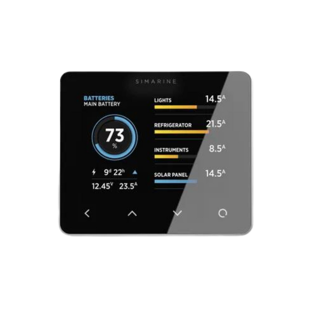 SIMARINE's advanced battery monitor for most demanding users. For up to 6 battery banks, 6 additional battery voltages, 14 tank level and 20 consumer or power generation readings. Compatible with all SIMARINE shunts and modules.
