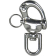 Stainless Steel Economical, cast 316 grade stainless steel snap shackle with small swivel bale head. Features plunger action, quick release firing pin and an off centre hinge pin.