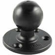 The RAM-D-202U consists of a 2.25" diameter rubber ball, connected at right angles to a 3.68" diameter round base. The base has pre-drilled holes, including two holes at 180 degrees and three holes at 120 degrees.