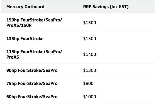 Savings are based on RRP and are subject to change without notice. Offer available on new Mercury 60-150HP four stroke outboards purchased between 20/10/25 to 15/12/25. The advertised maximum RRP savings of $1500 (inc GST) is based on a 150HP FourStroke model. Offer excludes freight and local statutory charges. Offer available to private customers only, promotion not to be used in conjunction with any other offer and cannot be redeemed for cash. Mercury reserves the right to extend offer. See your local participating Mercury Dealer or visit www.mercurymarine.com/au/en/Promotions for details. While stocks last.